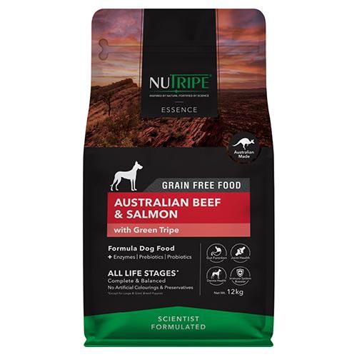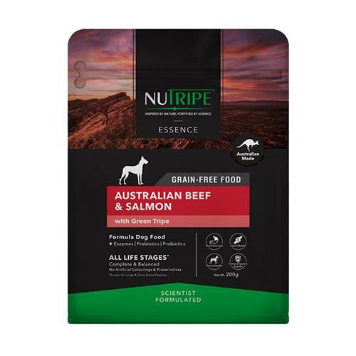 【原材料】オーストラリア産ビーフ、サーモン、グリーントライプ、サツマイモ、エンドウ豆、鶏脂、ナチュラルフレーバー、カボチャ、ほうれん草、ブロッコリー、リンゴ、クランベリー、ウコン、緑イ貝、塩化カリウム、ビタミン・ミネラル類(ビタミンA、D、E、K、B1、B2、B3、B5、B6、B12、葉酸、ビオチン、クエン酸、硫酸亜鉛、硫酸鉄、キレート亜鉛、キレート鉄、硫酸銅、酸化マンガン、キレート銅、キレートマンガン、ヨウ素、セレン)、塩化コリン、プレバイオティクス(フラクトオリゴ糖(FOS)、マンナンオリゴ糖(MOS))、タウリン、ケルプ、ユッカシジゲラエキス、L-リジン、酵素(アミラーゼ、プロテアーゼ)、プロバイオティクス(枯草菌)、DL-メチオニン、ミックストコフェロール、ローズマリーエキス