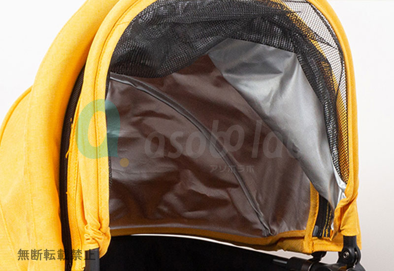 真夏でも安心してお出かけできるよう、内側にUVカット加工を施した、折りたたみ式のフードを搭載しています。