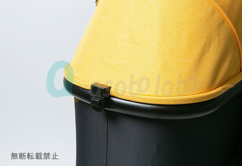 フードの開閉は、フードとキャリーコットに付いたバックルで簡単に行えます。