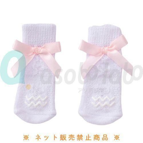 ダイヤ柄の編地で、足首にはピンクやブルーのリボンがついた可愛らしい靴下です。