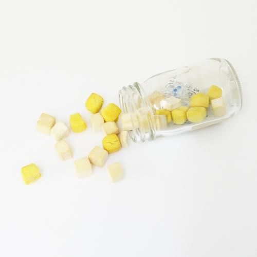 ビタミンCが豊富な馬鈴薯デンプンを主原料に牛乳より濃厚な味で、たんぱく質、脂質、カルシウム、ビタミン類が豊富な山羊みるくとビタミンA,B,E・食物繊維やデンプンを多く含むかぼちゃが入った噛み応えのある四角いボーロです。