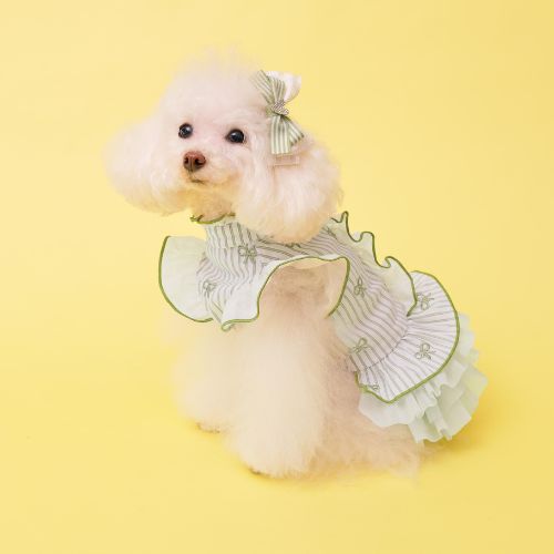 爽やかなストライプ生地に、繊細なリボン刺繍をあしらい、ギンガムチェックのフリルとチュールを重ねることで、軽やかで立体感のあるシルエットに仕上げました。