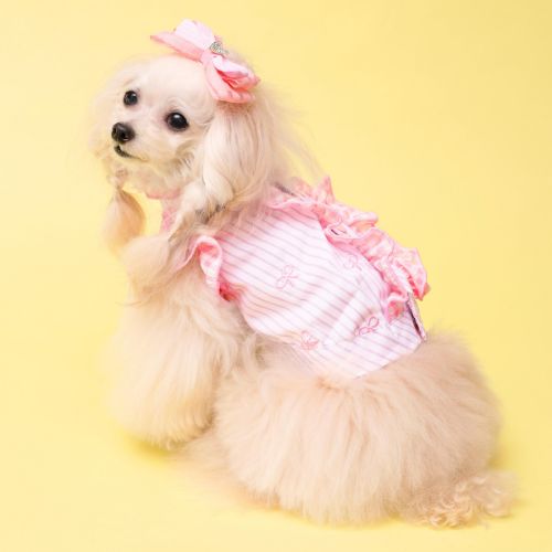 爽やかなストライプ生地に、繊細なリボン刺繍をあしらい、ギンガムチェックのフリルとチュールを重ねることで、軽やかで立体感のあるシルエットに仕上げました。