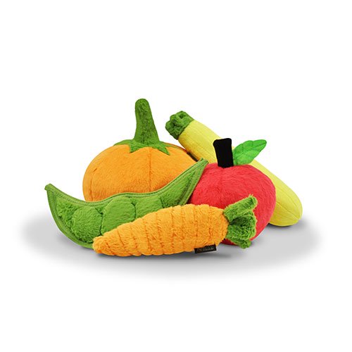 とれたて野菜をイメージした、愛らしい形をした5種類のフルーツ&ベジタブルのフワフワおもちゃです。